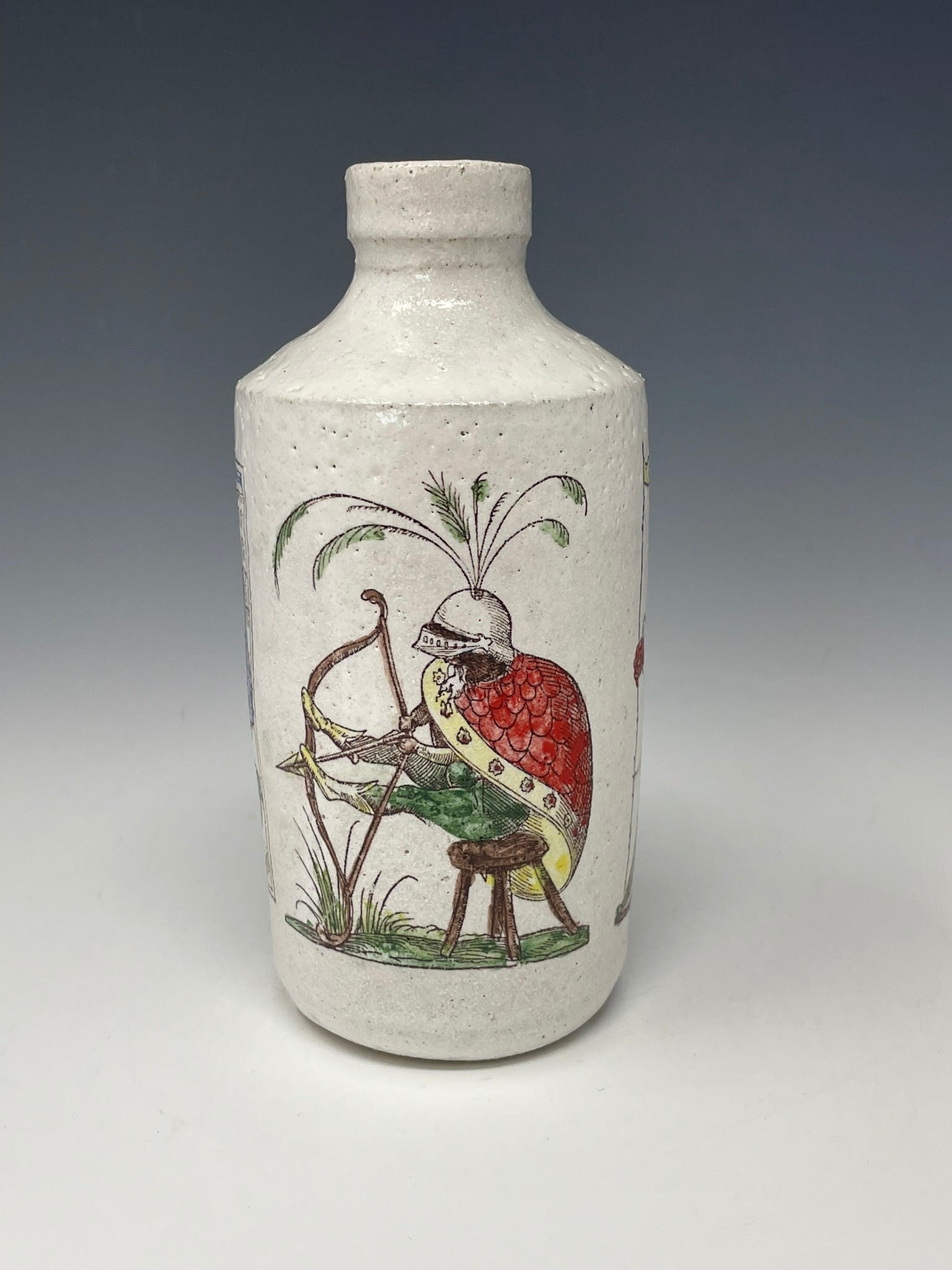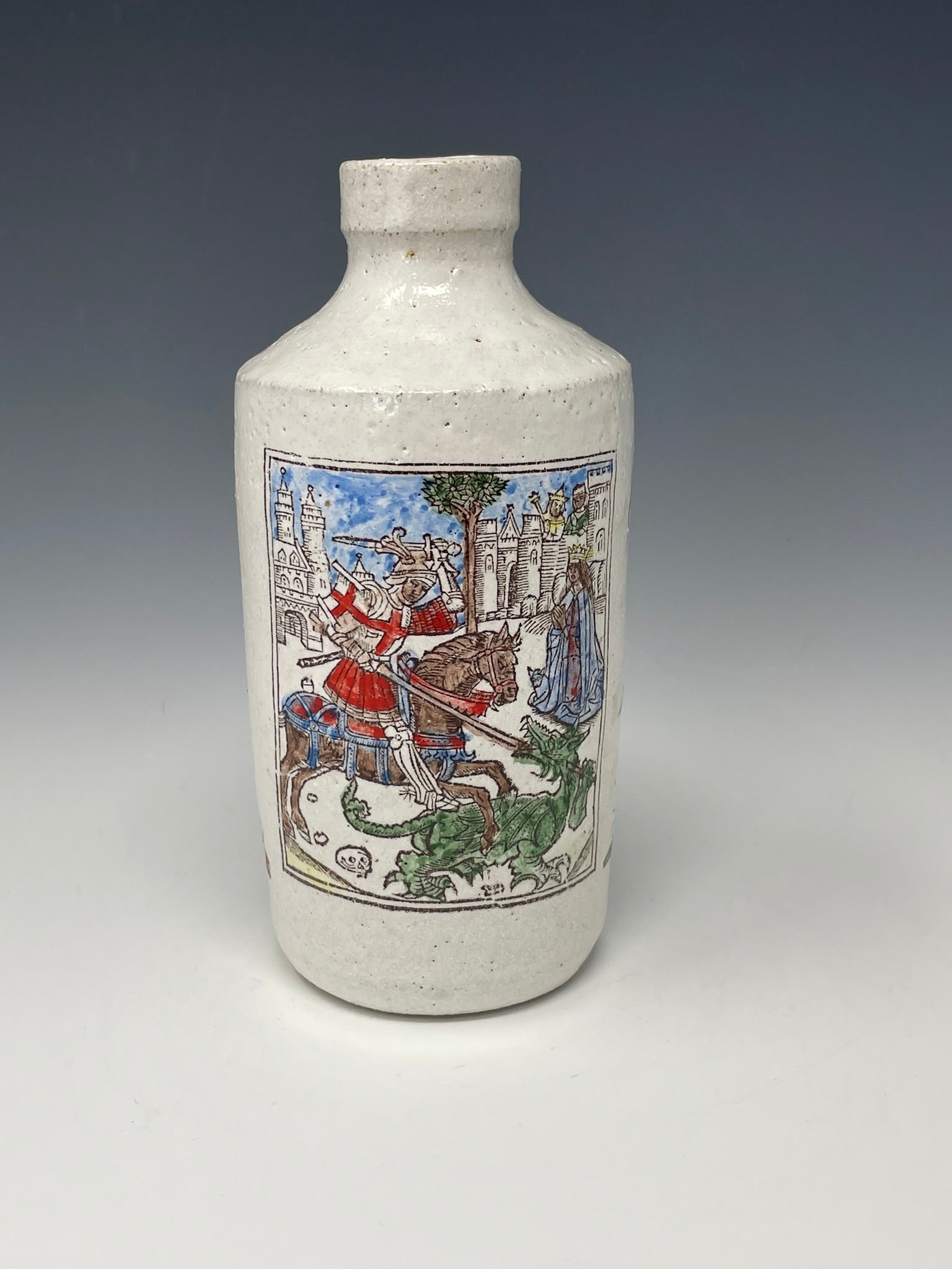 Bring the spirit of medieval legend into your home with this exquisite bottle vase, hand-painted in fine china paints with a scene of adventure and chivalry. Inspired by illuminated manuscript drollery, the design features the valiant Saint George poised to rescue a fair damsel from the clutches of a mischievous green dragon, while a group of knights looks on in awe—or perhaps amusement. Rich in historical charm and whimsical detail, this unique piece blends function with storytelling, making it a perfect treasure for lovers of medieval lore, fantasy, and one-of-a-kind ceramics.