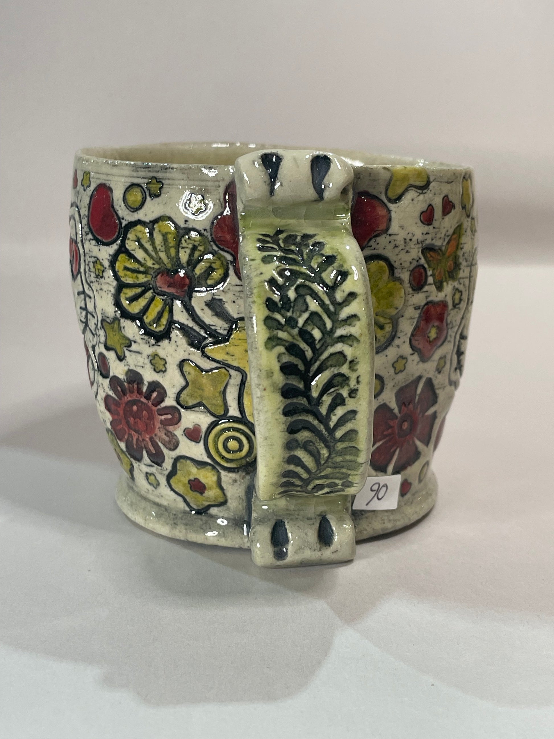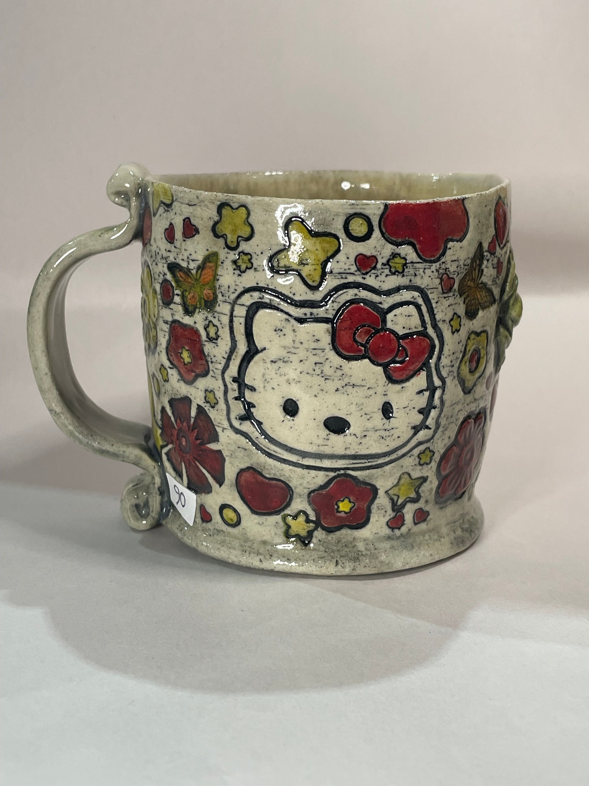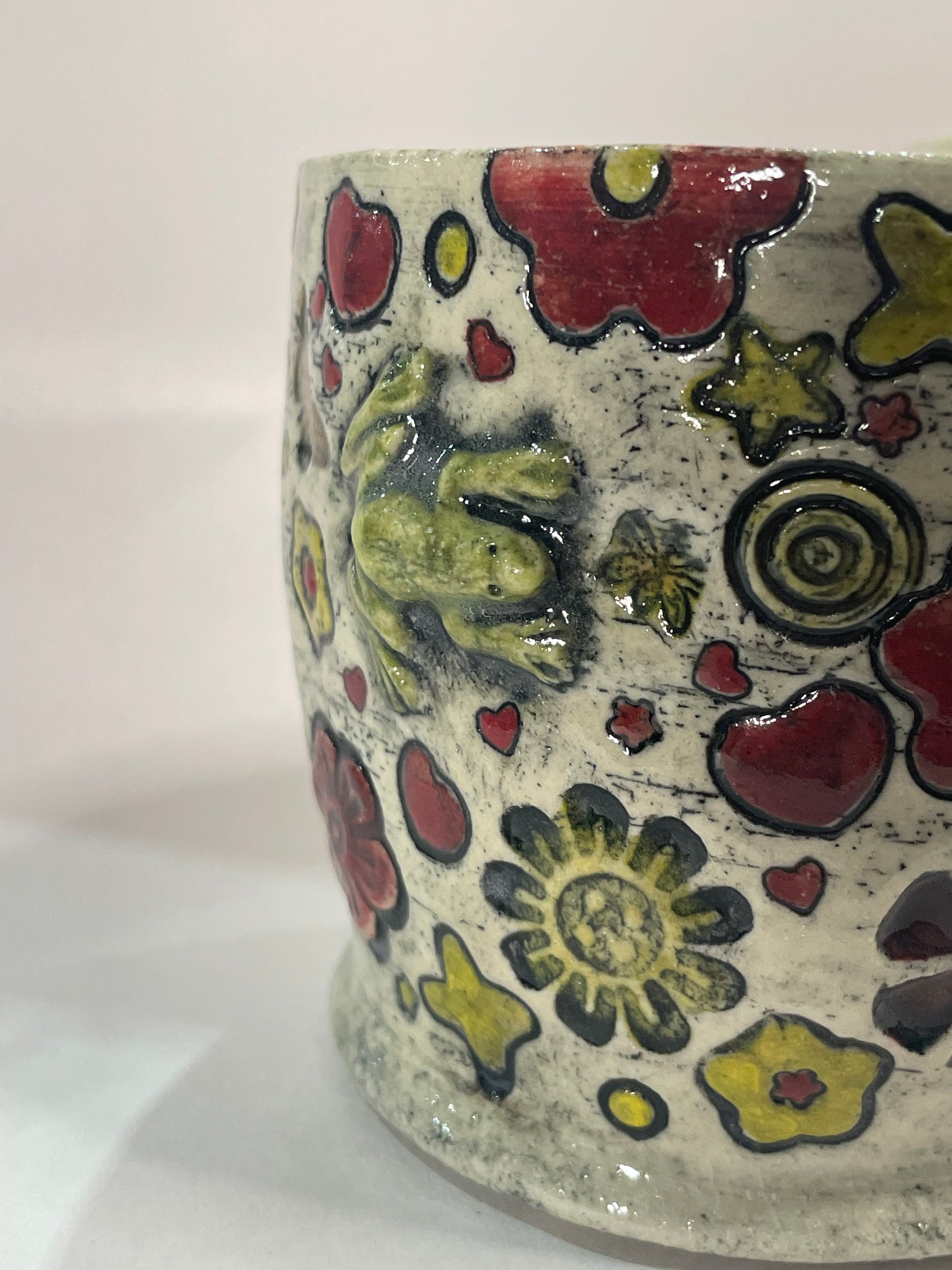 This handmade ceramic mug features impressed and hand-painted red flowers accented with playful H3llo Kittie motifs. Amoung the stamped surface is anlso a frog andding to a complex surface. Each piece is crafted individually, giving every mug its own unique character and charm. The glossy red and white details blend kawaii sweetness with a cozy, nostalgic feel. Perfect for coffee, tea, or cocoa, it’s both functional and collectible. Slight variations in the floral texture and painting make each mug one of a kind.